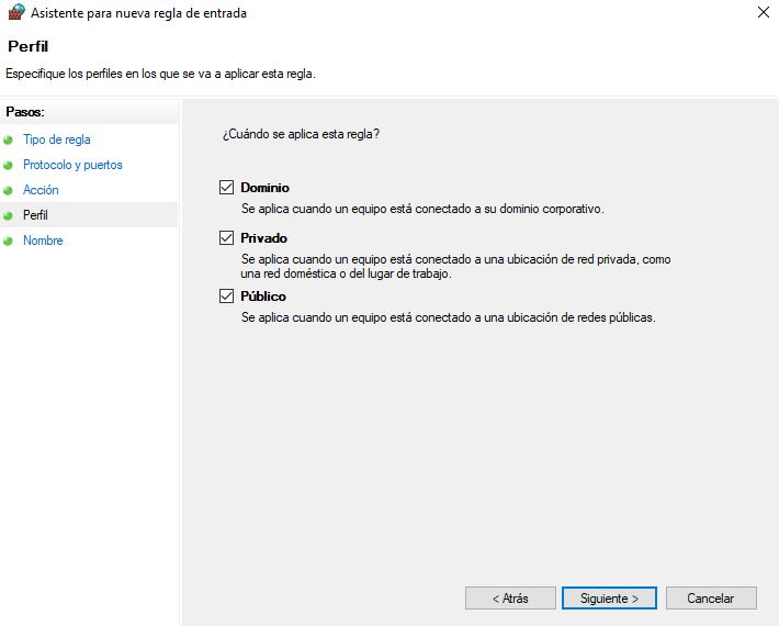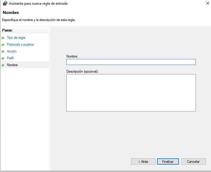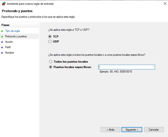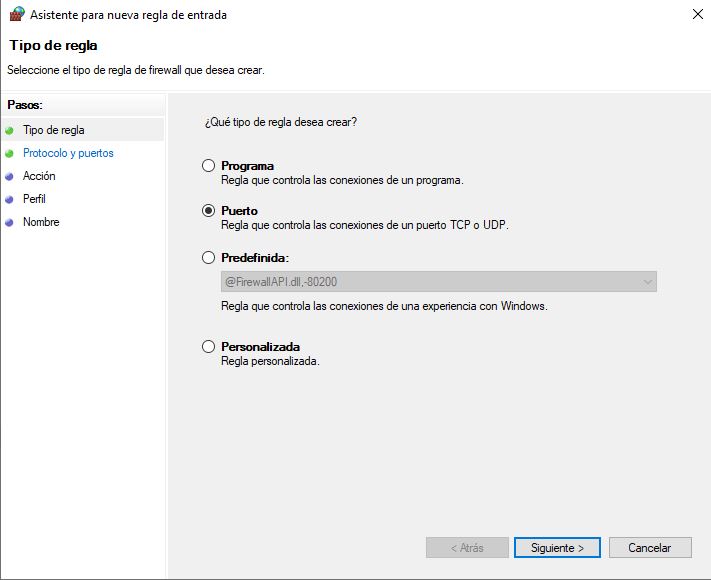 Al seleccionar "Nueva Regla" se visualizará la siguiente ventana, en la cual seleccionaremos el apartado de "Puerto".