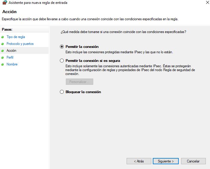 Luego, permitimos la conexión para dichos puertos habilitando "Permitir la Conexión".