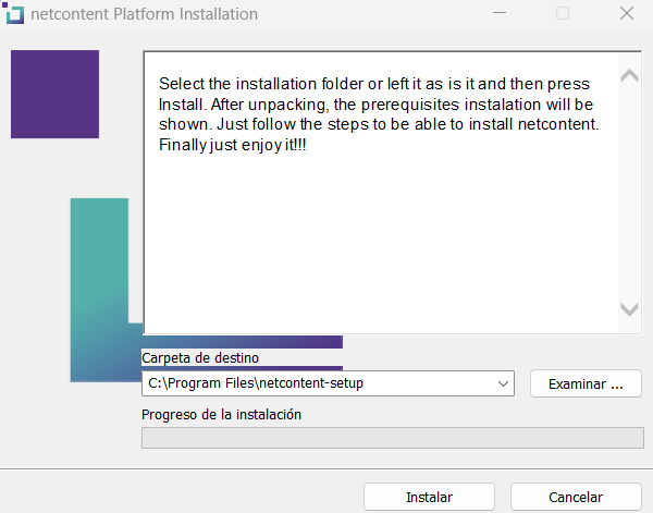 A continuación seleccione la carpeta de destino a donde se va a instalar Netcontent, por defecto se guardará en la ruta C:\Program Files (x86)\netcontent-setup. Si quiere cambiar la ruta haga click en "Buscar" y luego seleccione otra carpeta. Haga click en "Aceptar" y luego en "Instalar".