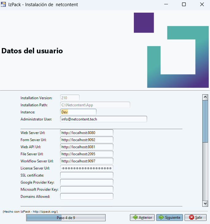 - License Server Url: URL de validación de licencias (SLIC) de Netcontent. (no modificar).